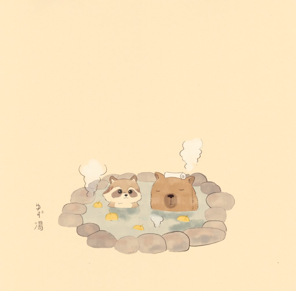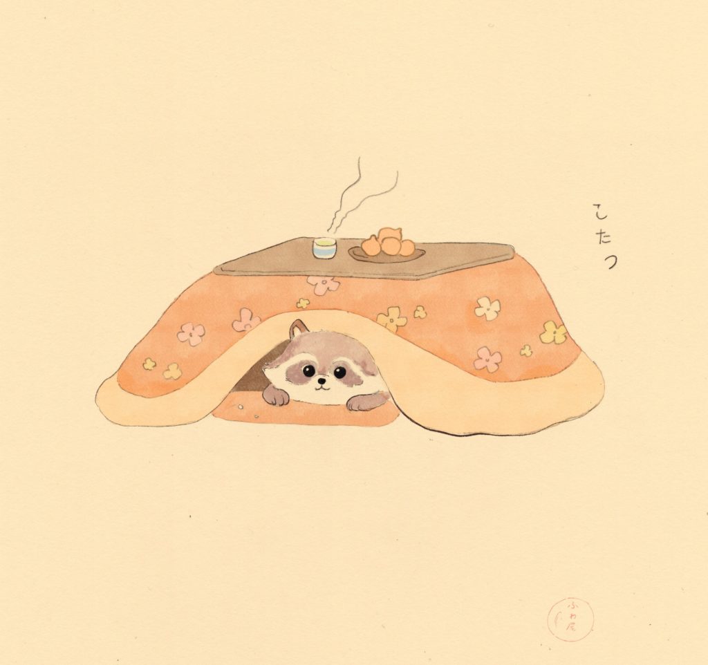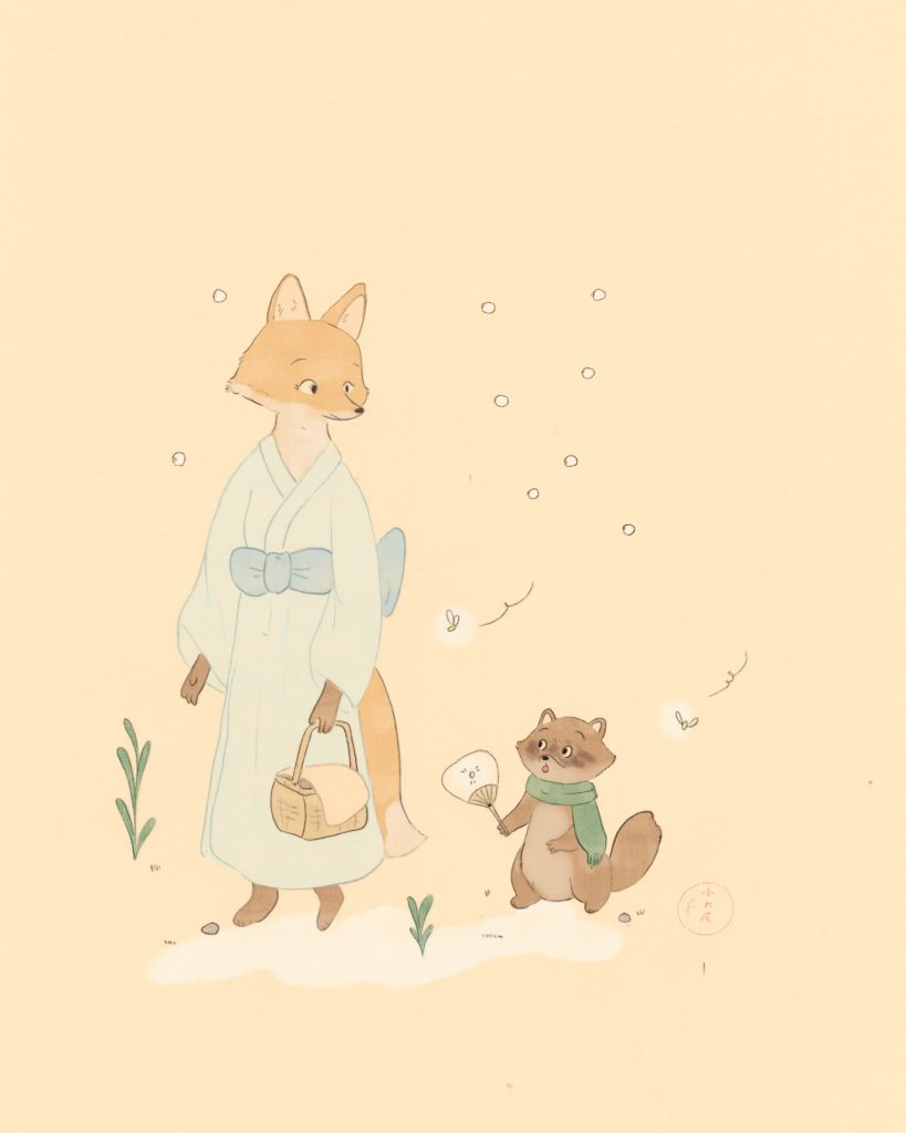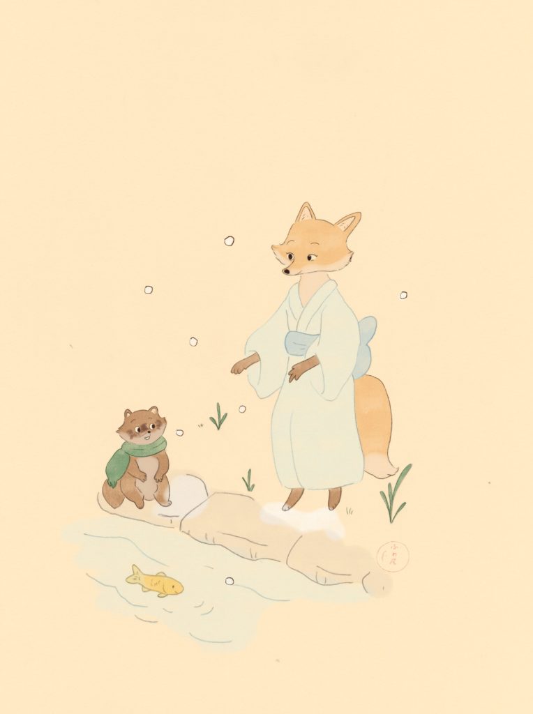 ページをめくると、キツネとタヌキのやさしい日々が広がります。小さな仕草と静かな物語──ごはんの湯気、川辺の光、けむる朝、しずかな夕暮れ…